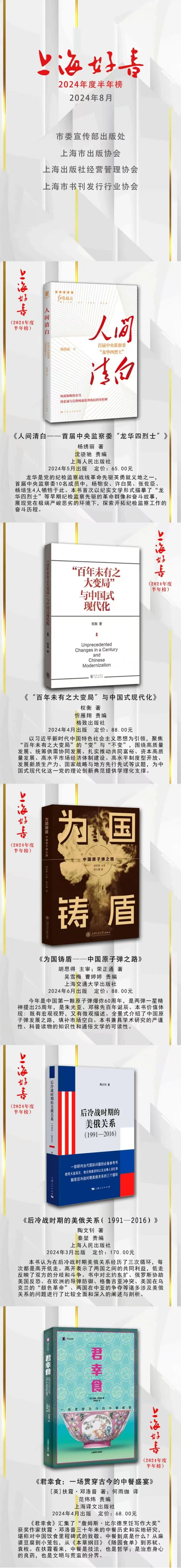 为深入学习贯彻习近平总书记考察上海重要讲话精神,推进书香社会建设,打造习近平文化思想最佳实践地,鼓励推出更多具有较高思想含量或艺术水准、可读性强的精品图书,上海市新闻出版局与市出版协会、上海出版社经营管理协会、市书刊发行行业协会共同策划“上海好书”评选推介活动。8月13日,2024上海书展开幕前一天,“上海好书”半年榜向社会发布,包含30种今年上半年出版的图书,有望成为读者来到上海书展“按图索骥”寻找好书的指南。